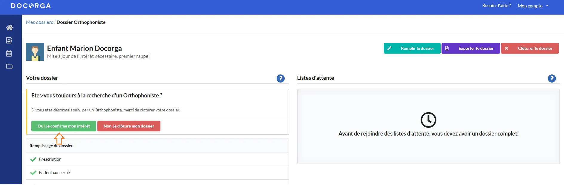 - Si vous êtes toujours en attente de prise en charge et que vous souhaitez rester sur la liste d'attente du ou des praticiens ciblés sur Docorga, cliquez sur "Oui, je confirme mon intérêt". Les praticiens sauront ainsi que votre demande est toujours en cours.